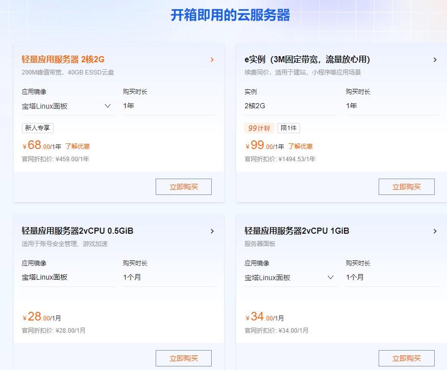 入门款:2核2G3M带宽,68元/年(小型项目适用)。